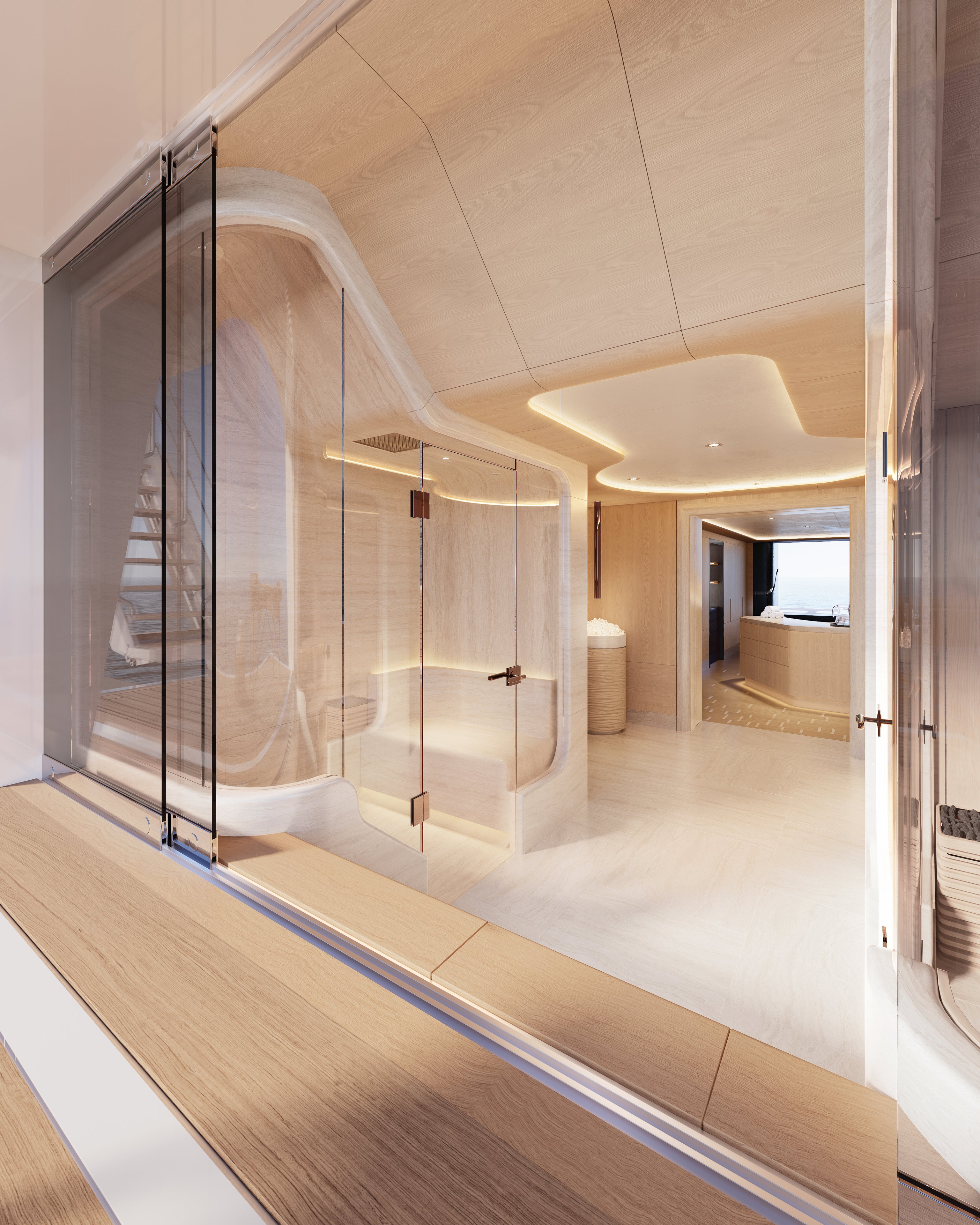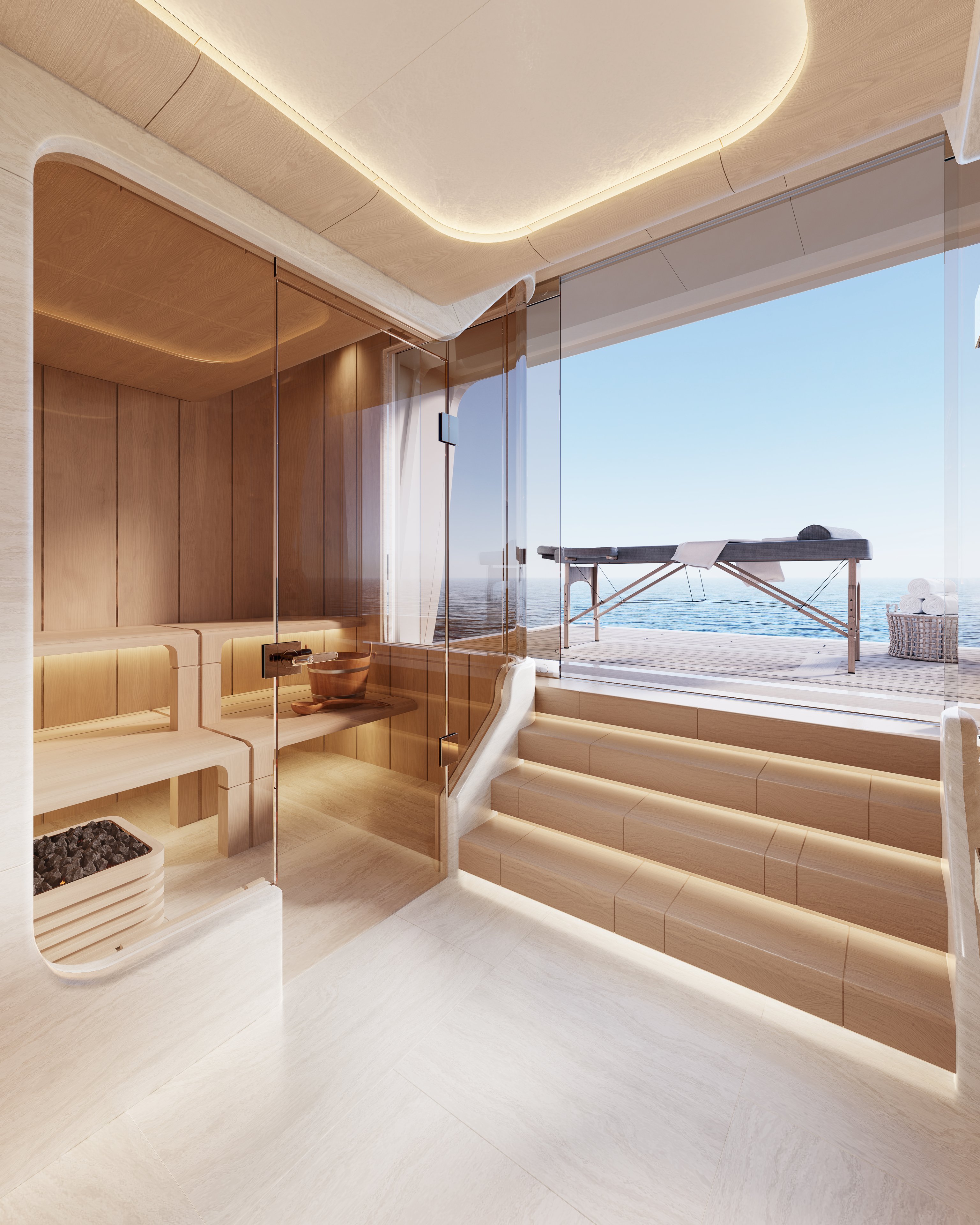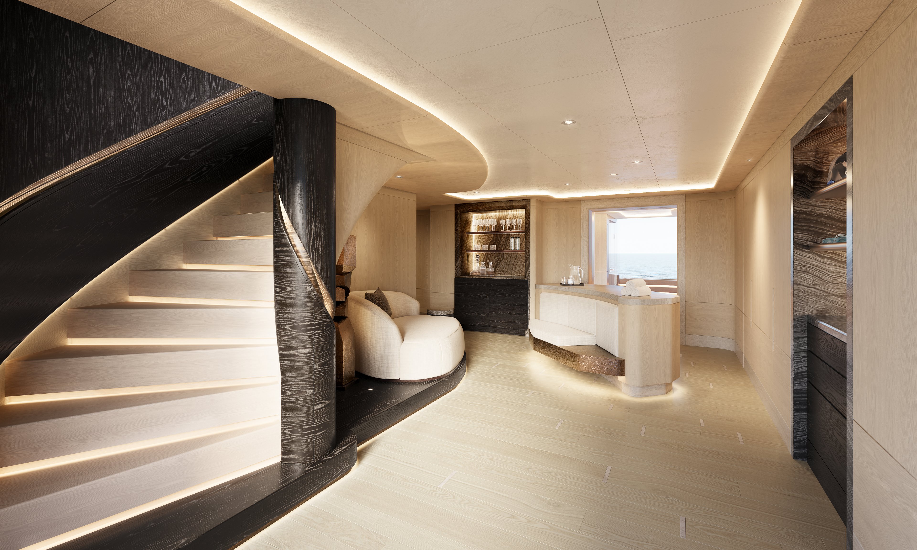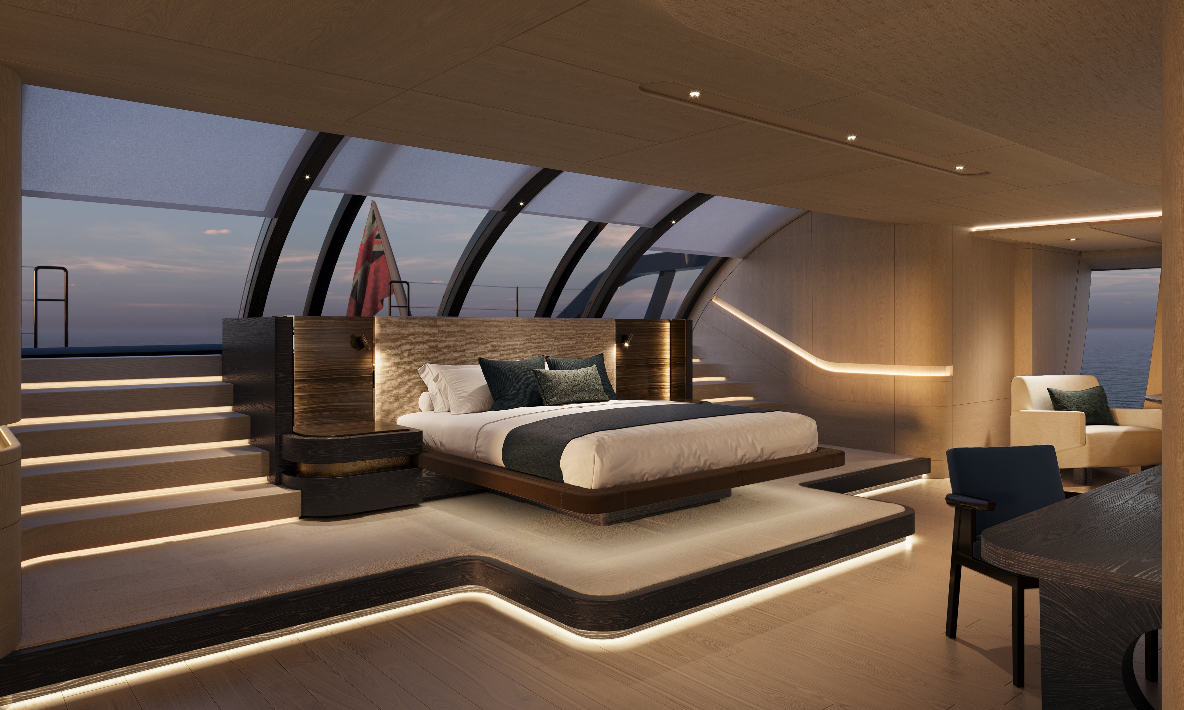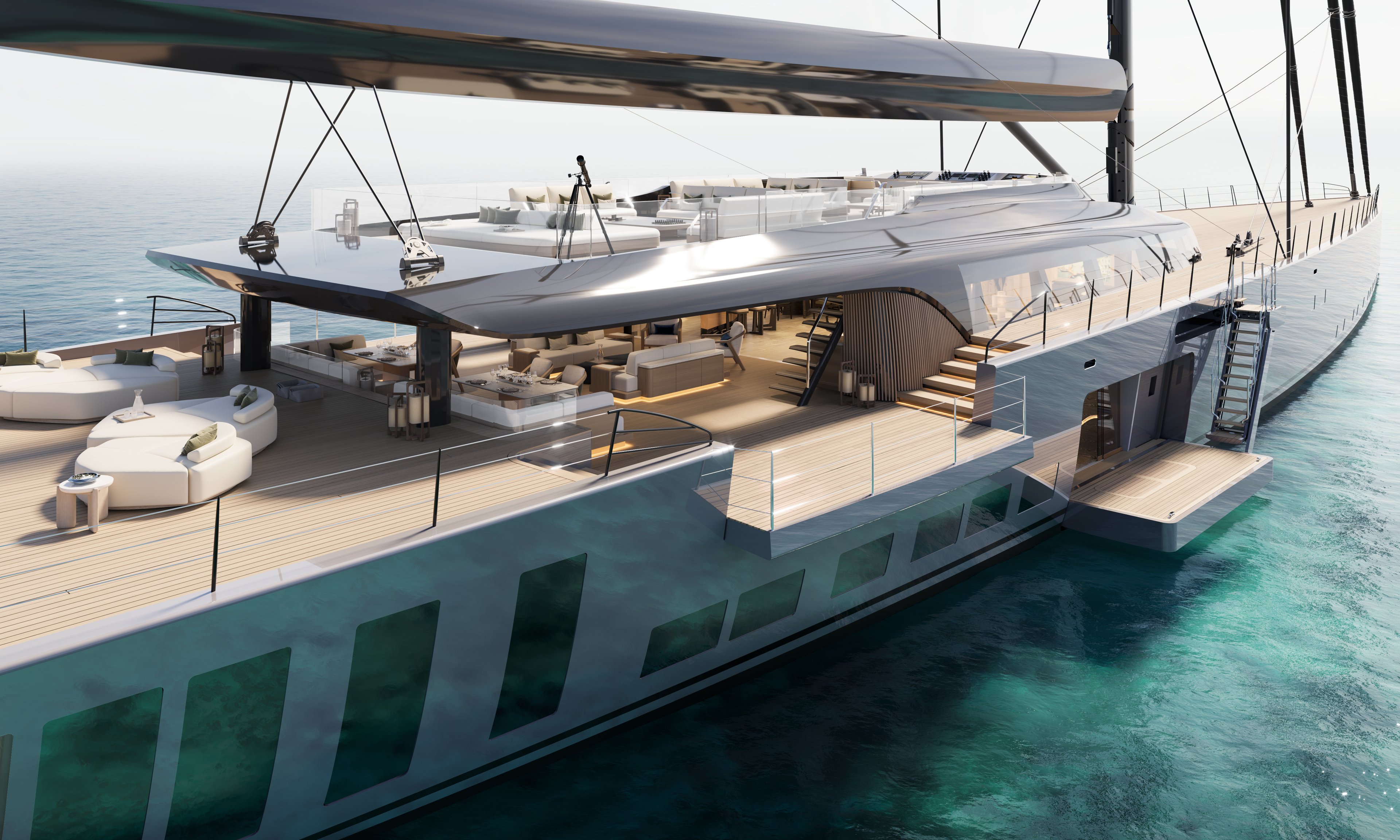 Above, the yacht’s profile is defined by her impressive sail plan, engineered and constructed by Rondal, featuring a cutting-edge, high-tech rig optimised for both performance and handling. This combination ensures that despite her size, SKY will be a true sailor’s yacht—capable of exhilarating speed while maintaining effortless control.