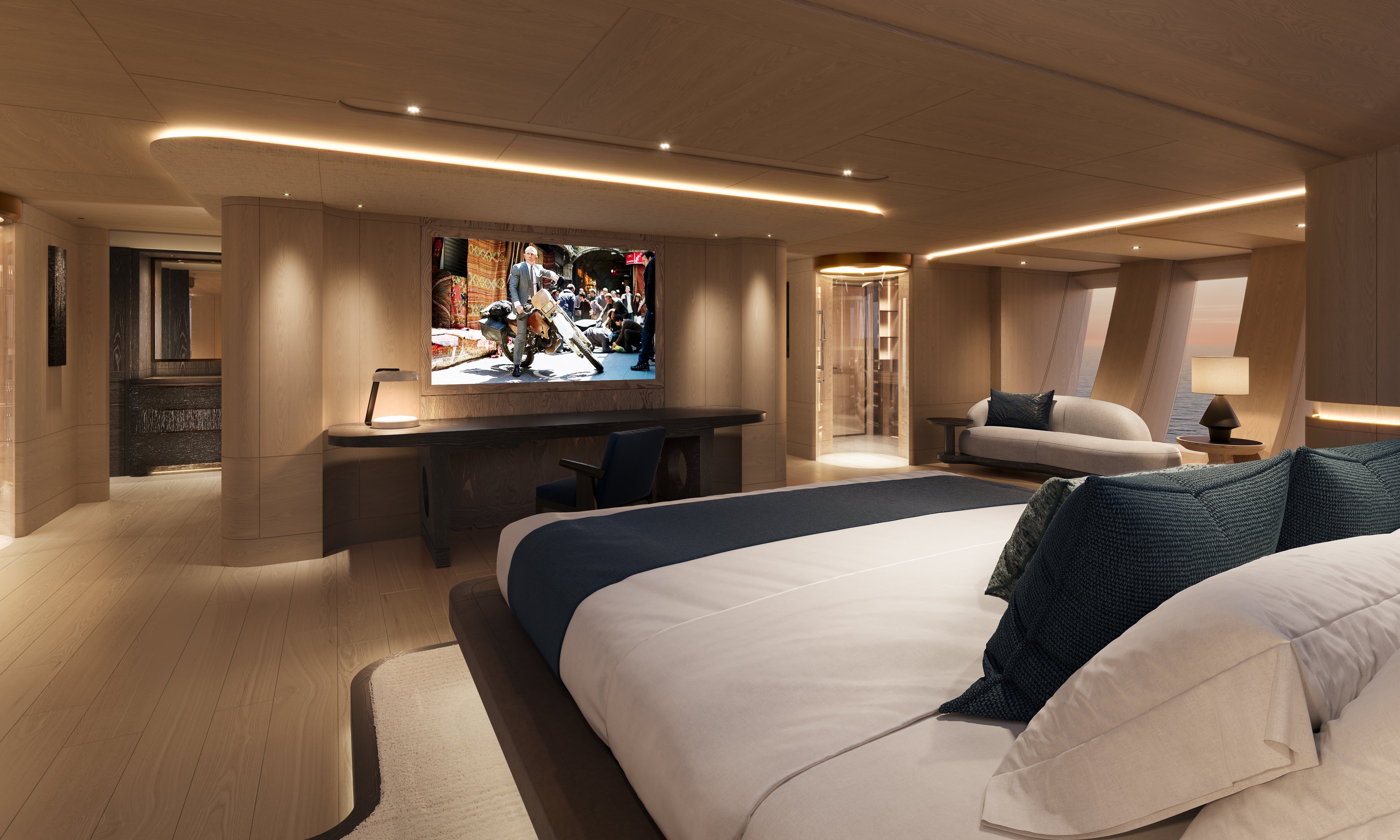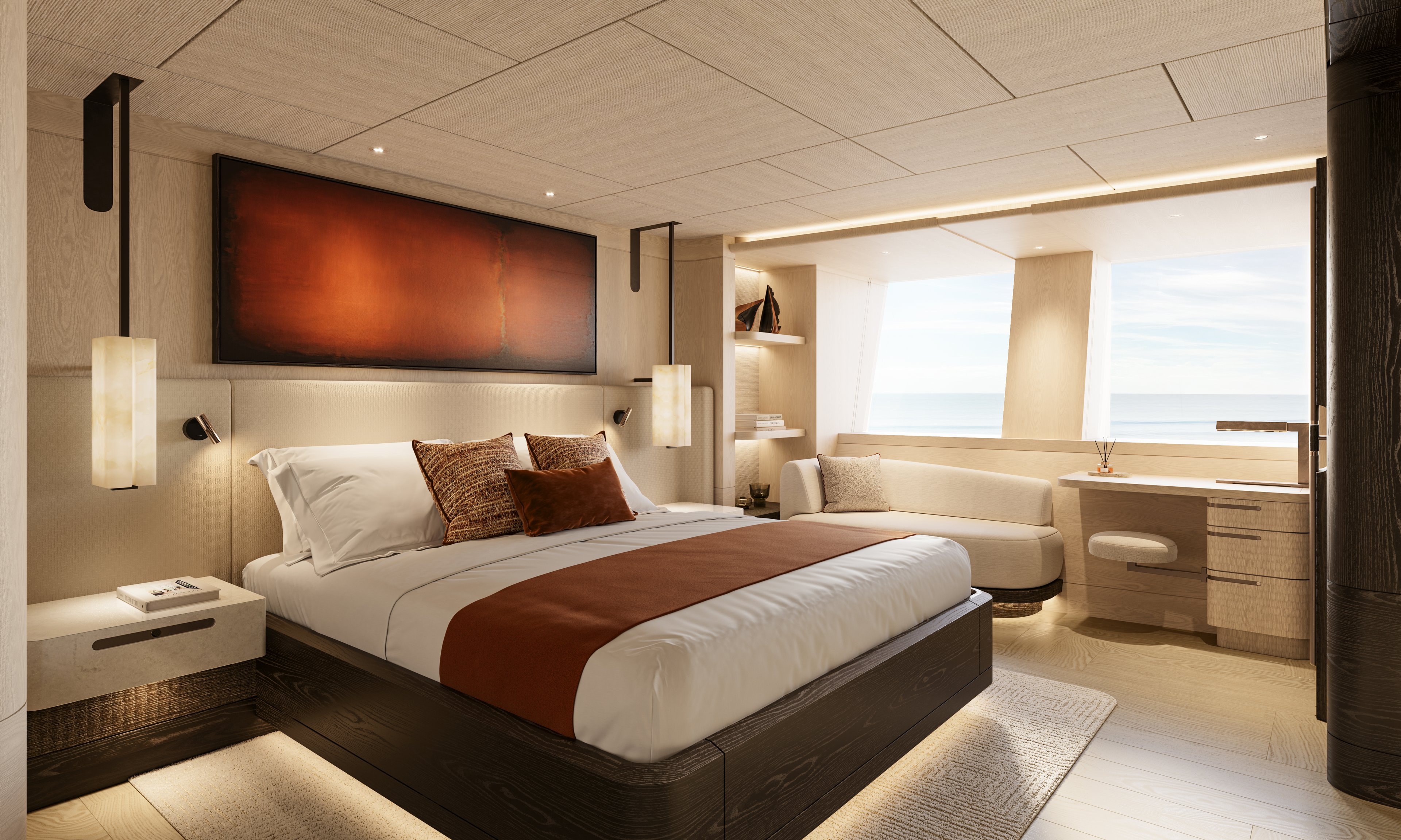 Amidships, the generous lazarette watersports area comes to life with folding hull doors, creating a versatile beach-style environment for launching tenders and toys or simply enjoying time at the water’s edge. Aft, the owner’s stateroom spans the full beam, delivering a retreat of remarkable volume and privacy, underscored by abundant natural light and a direct connection to the sea.